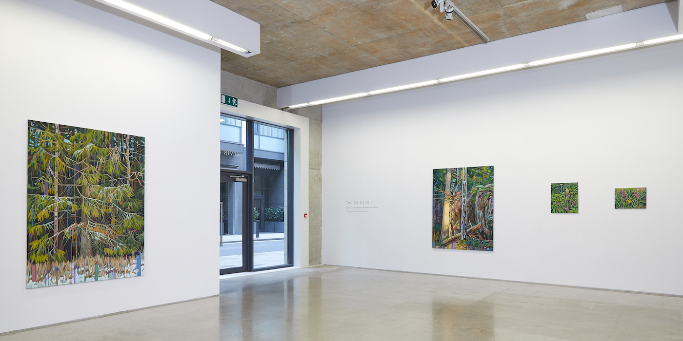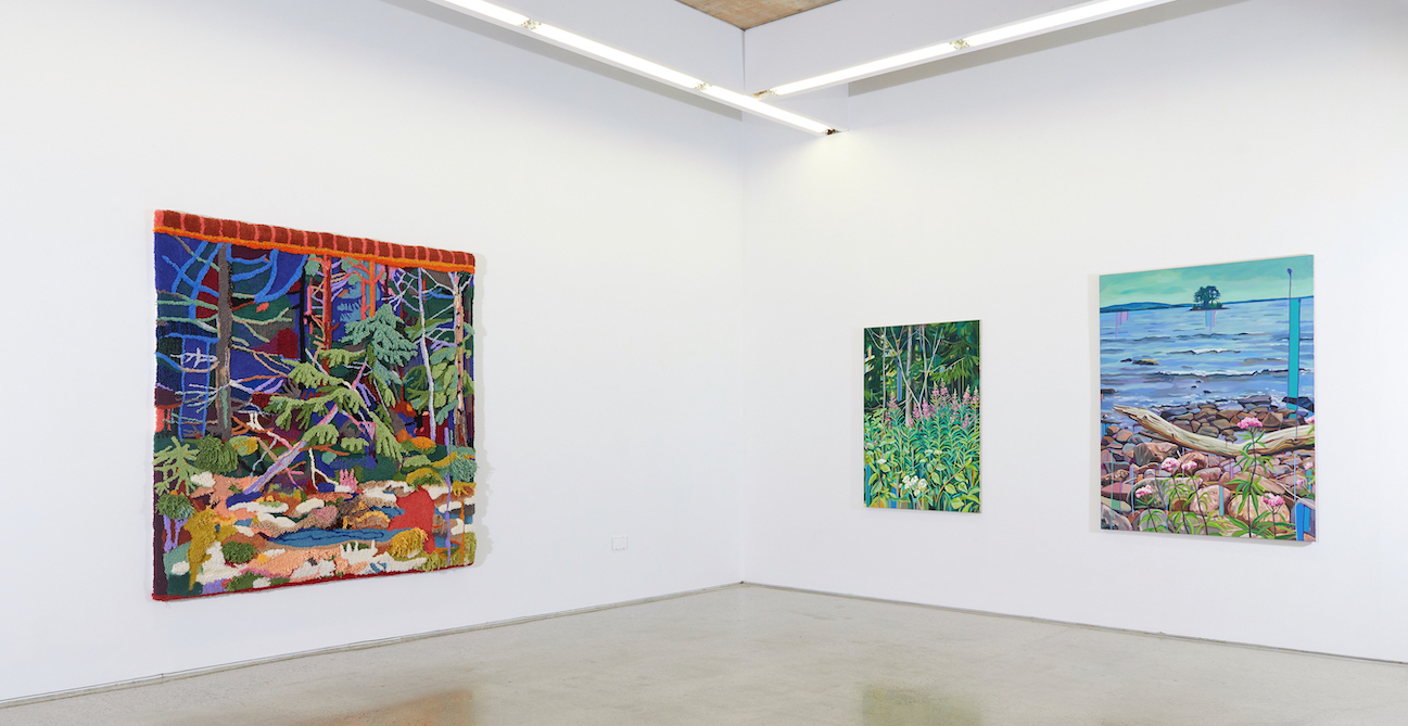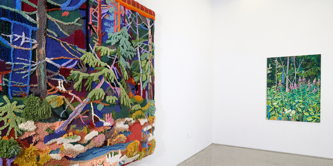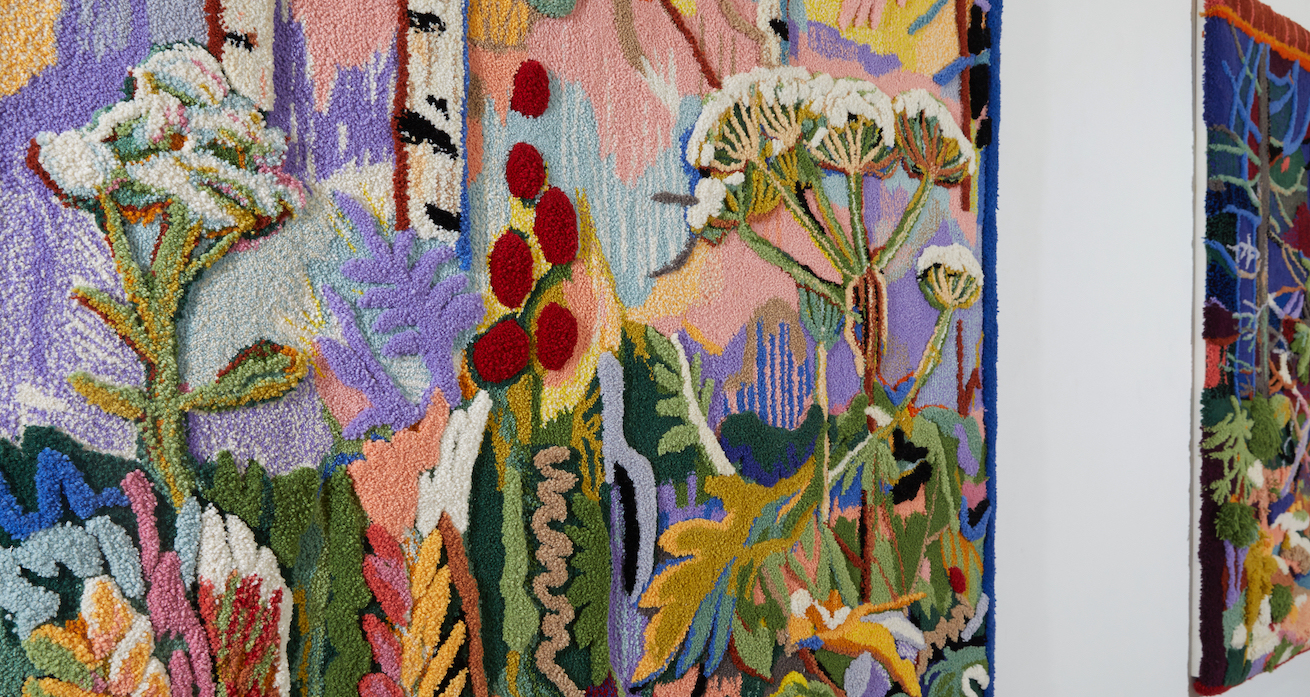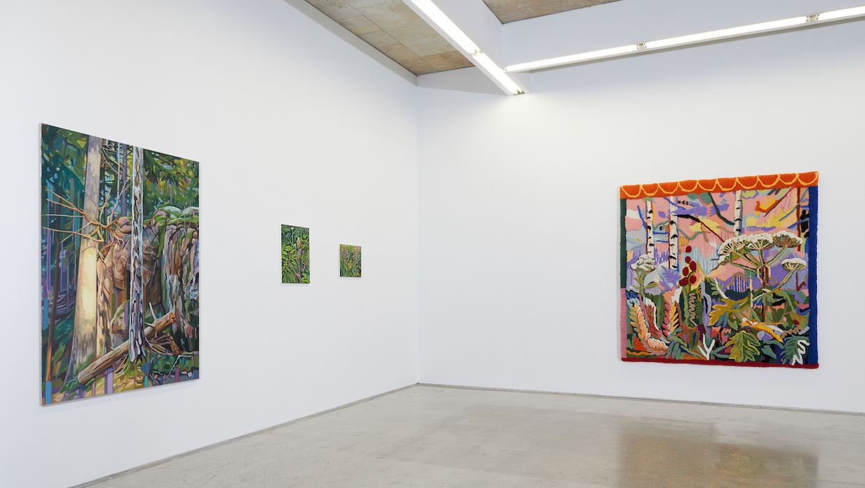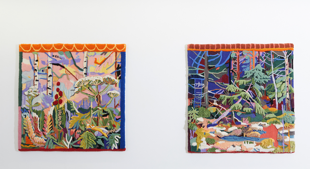 Cecilia Danell's exhibition Brush Lightly Through Fireweed Forests encompasses large, hand-tufted rugs and paintings inspired by her own encounters with the landscape of the area in Sweden where she grew up. In her process based practice, research into landscape and the psychology of place is coupled with a strong interest in materiality and making. Treating the landscape as an extension of the Self, Danell's research takes in classic speculative fiction and Science-Fiction novels, with special focus on how the natural world is rendered in these stories and how it ties in with the human urge to find solace in a primeval landscape, although wilderness is mostly a construct. The notion of constructing narratives particularly interests the artist and in her journeys through the real landscape she’s drawn to settings that have a theatrical, enchanted feel. Historical, water-filled mine holes could be portals into other worlds, a piece of driftwood resembles an ancient, petrified sea creature, there are thickets abundant with fireweed and a tree trunk blazingly illuminated by the winter sun. Although real locations act as the starting point, the process of selecting and rendering each scene creates something separate, more closely related to storybooks and dream imagery. The departure into large-scale rug tufting saw Danell convert her studio into a temporary tufting workshop for the duration of the spring, resulting in two hand-tufted works with a framing reminiscent of theatre scenery, where the tactility of the yarn adds another dimension to the rendering of moss and grasses. The scale of these new works; paintings and rugs, invite the viewer to step into the scene, finding themselves somewhere between reality and fiction.