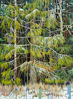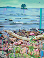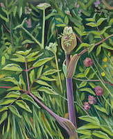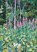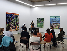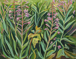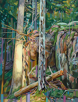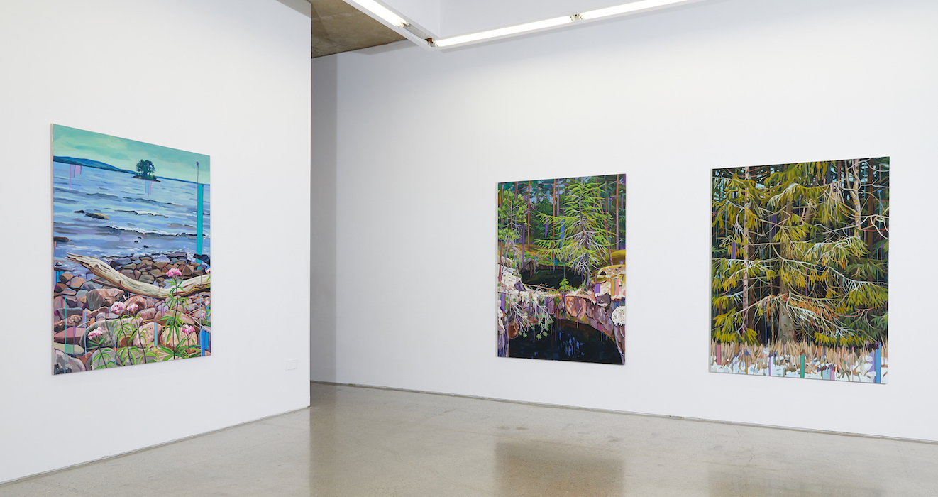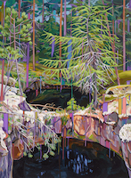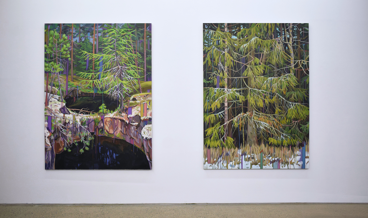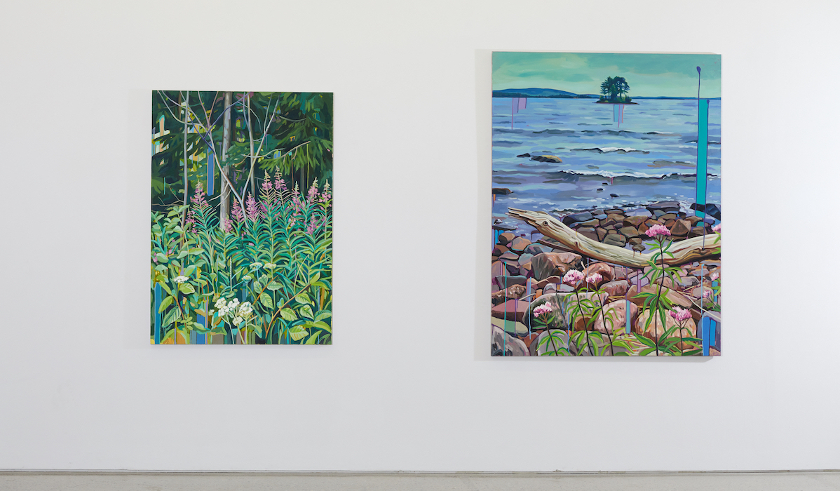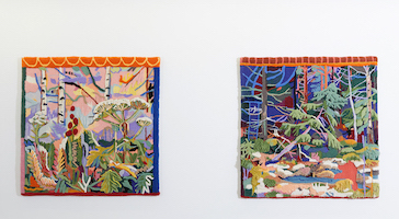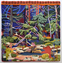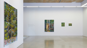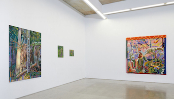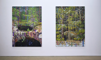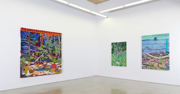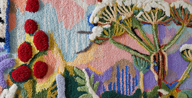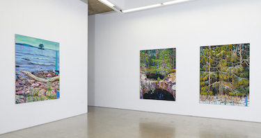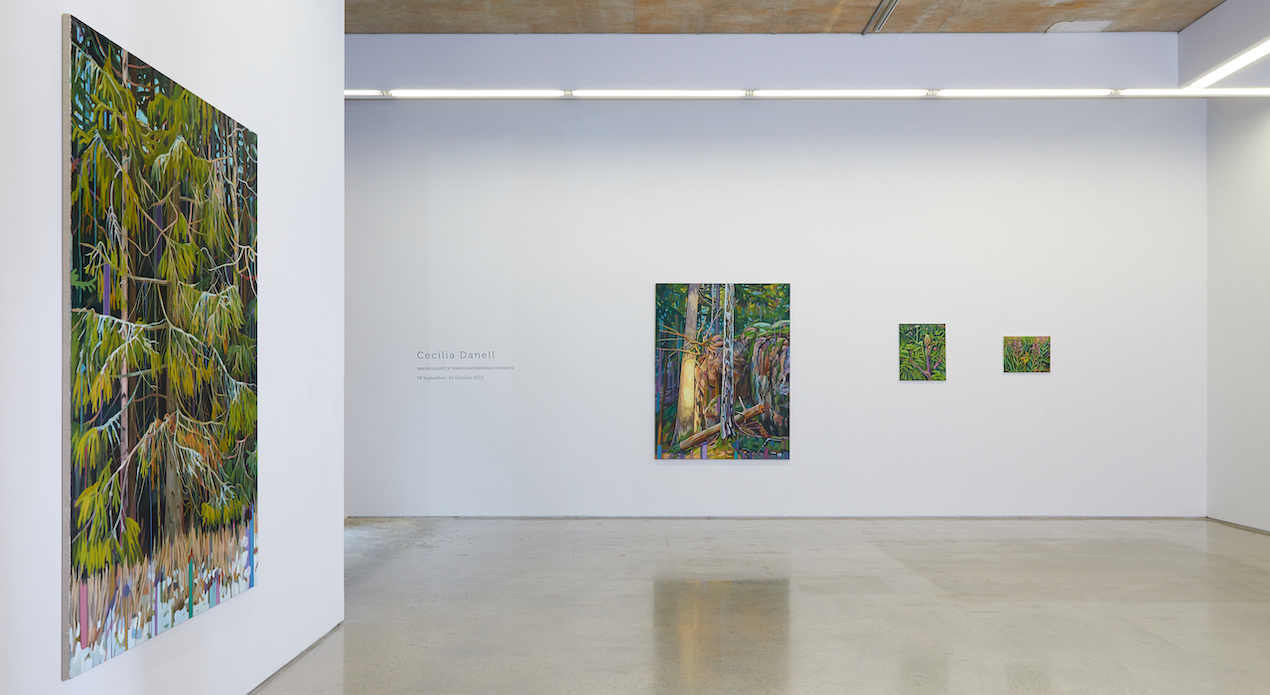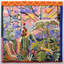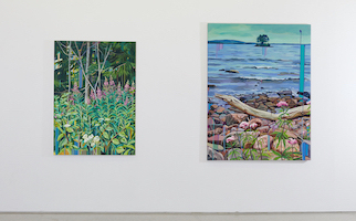 Cecilia Danell's exhibition Brush Lightly Through Fireweed Forests encompasses large, hand-tufted rugs and paintings inspired by her own encounters with the landscape of the area in Sweden where she grew up. In her process based practice, research into landscape and the psychology of place is coupled with a strong interest in materiality and making. Treating the landscape as an extension of the Self, Danell's research takes in classic speculative fiction and Science-Fiction novels, with special focus on how the natural world is rendered in these stories and how it ties in with the human urge to find solace in a primeval landscape, although wilderness is mostly a construct. The notion of constructing narratives particularly interests the artist and in her journeys through the real landscape she’s drawn to settings that have a theatrical, enchanted feel. Historical, water-filled mine holes could be portals into other worlds, a piece of driftwood resembles an ancient, petrified sea creature, there are thickets abundant with fireweed and a tree trunk blazingly illuminated by the winter sun. Although real locations act as the starting point, the process of selecting and rendering each scene creates something separate, more closely related to storybooks and dream imagery. The departure into large-scale rug tufting saw Danell convert her studio into a temporary tufting workshop for the duration of the spring, resulting in two hand-tufted works with a framing reminiscent of theatre scenery, where the tactility of the yarn adds another dimension to the rendering of moss and grasses. The scale of these new works; paintings and rugs, invite the viewer to step into the scene, finding themselves somewhere between reality and fiction.
